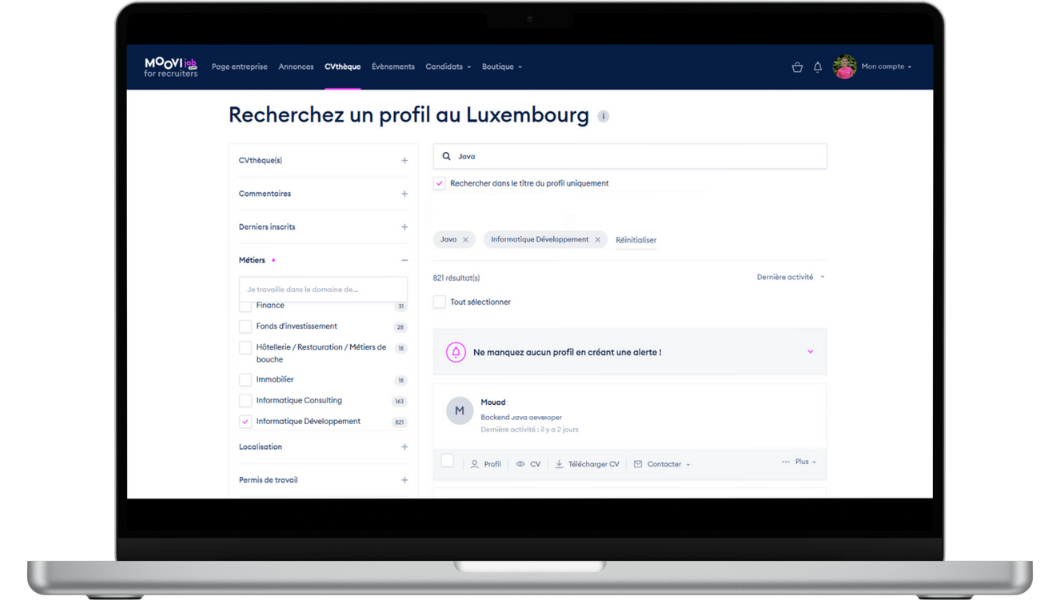 - La CVthèque Moovijob.com, qui regroupe tous les candidats disposant d’un compte sur la partie jobboard de notre site.
