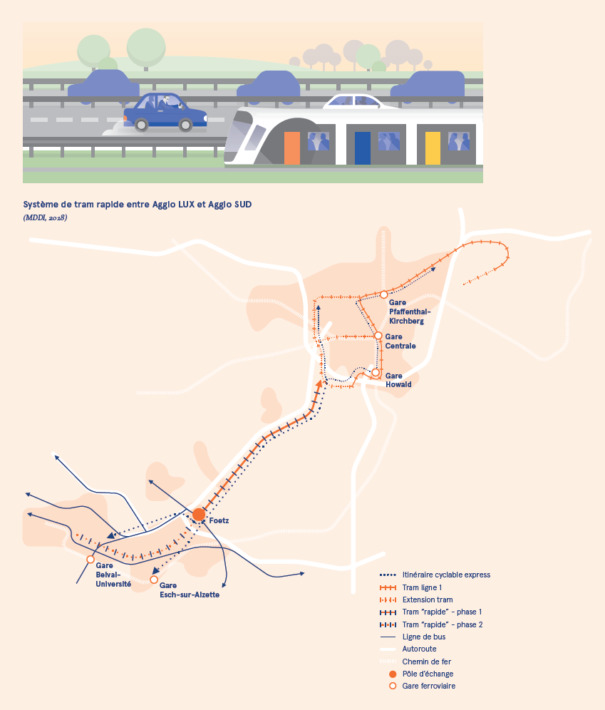 En allant de la Cloche d’Or à Belvaux, le nouveau tram rapide permettra de relier les deux plus grandes agglomérations luxembourgeoises, à savoir la capitale et celle du Sud du pays. Des villes comme Esch-sur-Alzette, Foetz ou encore Belval seront mieux connectées à la Ville de Luxembourg. Le trajet de Belvaux jusqu’à la Cloche d’Or devrait durer environ 45 minutes.