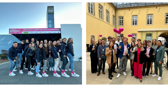L'équipe Moovijob.com au salon Moovijob Day Luxembourg 2024 (à gauche) et à la soirée Moovijob Night Luxembourg 2024 (à droite)